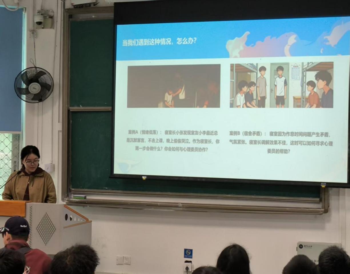 黄老师强调:“寝室是大学生在校生活的核心场所,寝室长作为校园心理健康防护的‘第一道防线’,要敏锐关注室友心理动态、及时察觉异常情况;心理委员则需当好‘信息桥梁’,既要做同学们愿意倾诉的贴心人,也要成为连接学生、辅导员与学院的沟通纽带,共同守护身边同学的心理健康。”