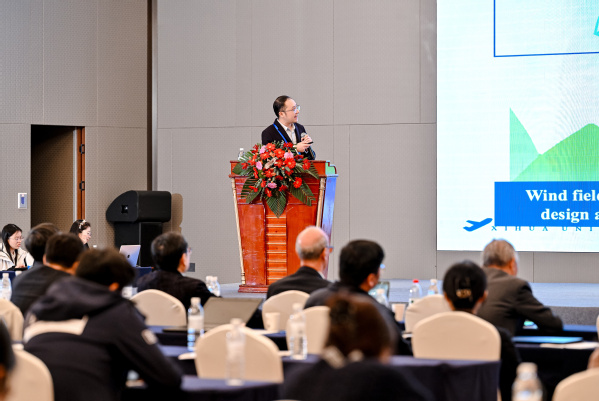 作为本届年会的重要协办方之一,西华大学在推动学术交流的同时,也深度参与了技术研讨。航空航天与智能装备学院副院长杜海教授应邀参加年会,并在“先进飞行器技术与低空运行”专题论坛上以“Aerodynamic Challenges and Key Technologies in Low-Altitude Vehicle Design”为题作报告分享,从复杂低空飞行环境、低空飞行空气动力学关键技术、发展路径与实践初探三个维度展开,系统介绍了我校研究团队在低空飞行器抗风设计、抗风试验等方面的关键技术突破与实践经验,为行业发展提供的“西华方案”,受到与会专家的广泛关注。