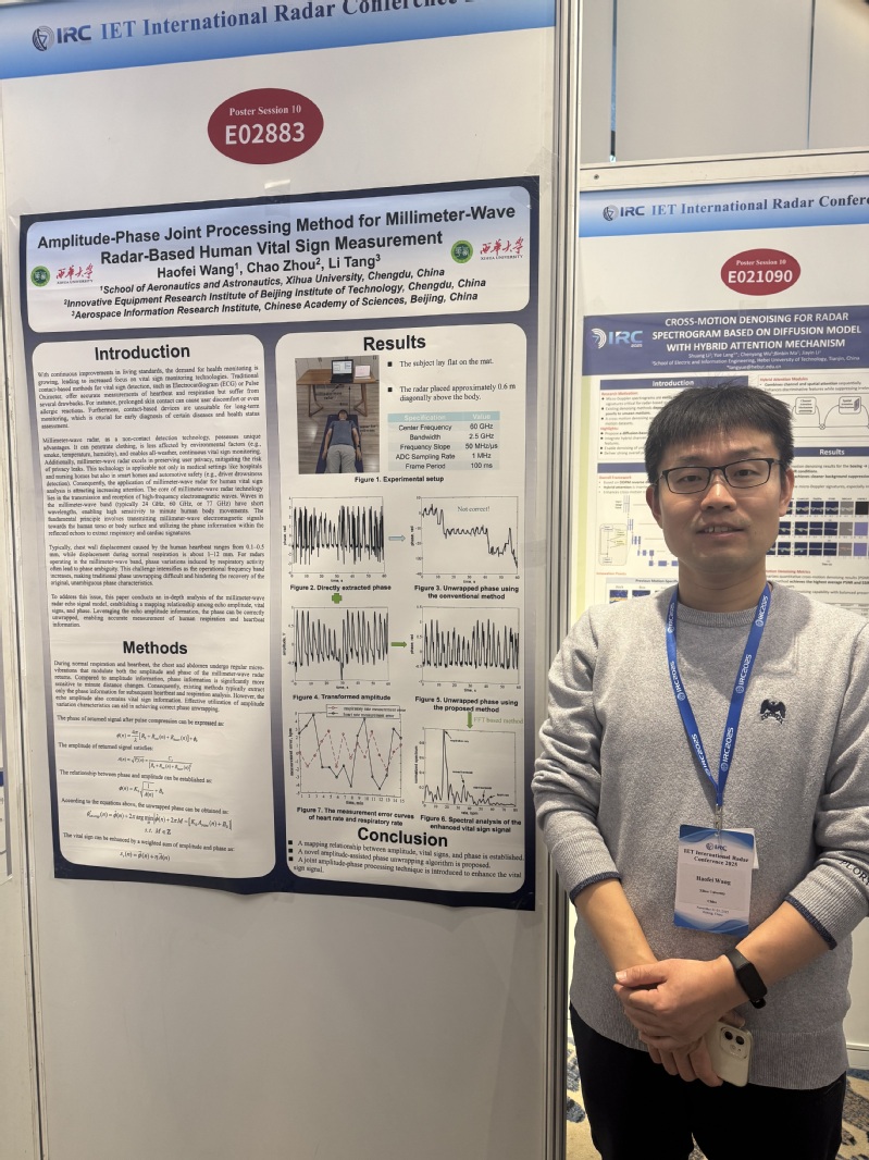 IET国际雷达会议于2025年11月21日-11月23日在中国嘉兴隆重举行,会议由英国工程技术学会(IET)、北京理工大学、中国电子学会雷达分会和信号处理分会联合举办。我院青年教师王昊飞博士现场参加本次会议,并以poster形式展示了其在毫米波雷达人体生命体征信号探测方向的工作进展,同与会专家学者围绕雷达在室内人体智能感知领域的应用前景展开了深入的交流与探讨。