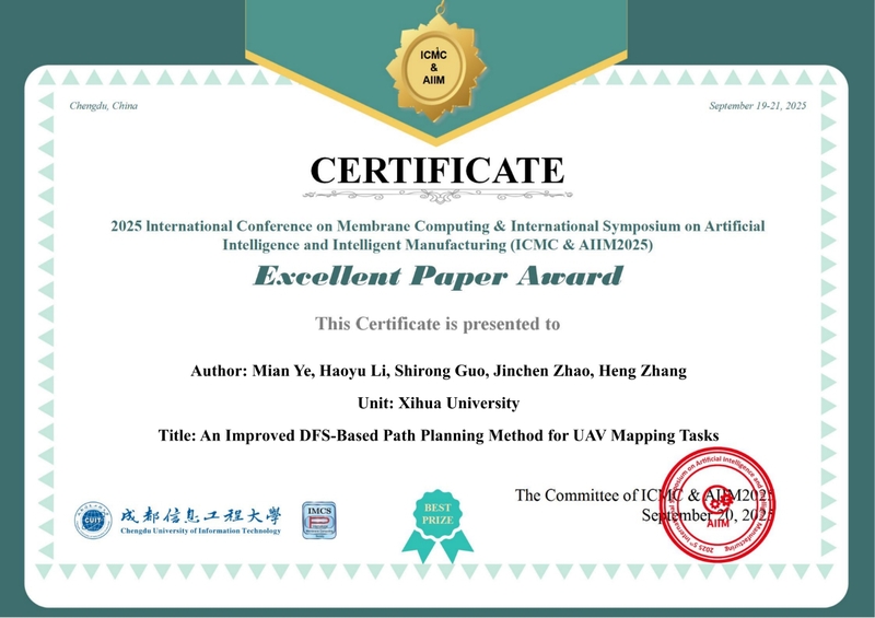 在学术导师叶勉副教授的指导下,无人驾驶航空器系统工程专业本科生郭士荣与李浩宇共同完成的学术论文《An Improved DFS-Based Path Planning Method for UAV Mapping Tasks》以低空为背景,旨在解决大范围无人机测绘中路径重复率高、转向频繁、能耗过大等实际难题。论文创新性地提出了一种改进的深度优先搜索(DFS)路径规划方法,有效提升了路径规划的连贯性与效率。该论文凭借前沿的观点、严谨的理论、简致的表达在百十余篇参会论文中表现突出,广受现场评审专家好评,并荣获大会“优秀论文”。