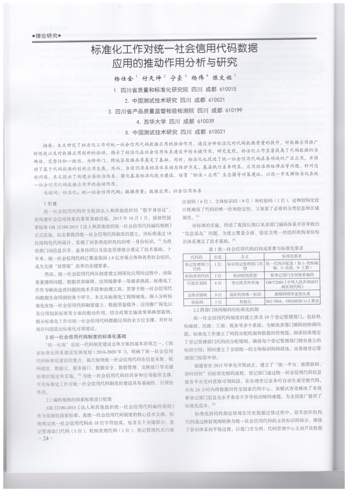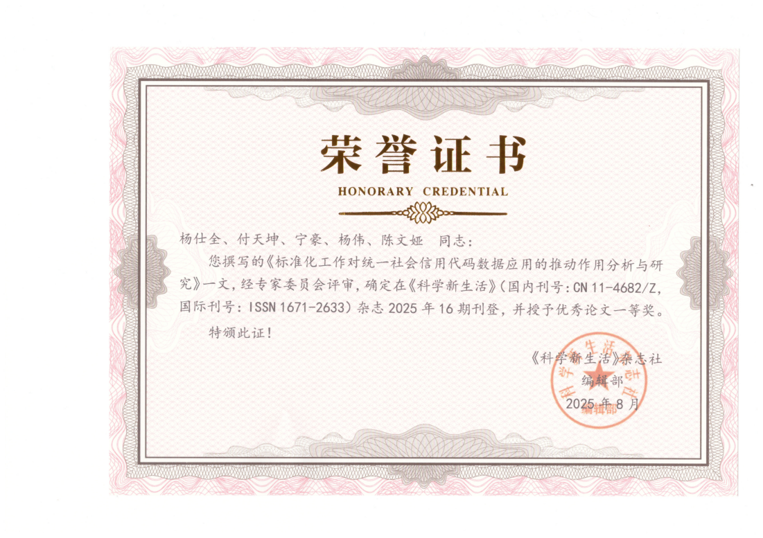 西华大学航空航天学院杨伟教授参与撰写的《标准化工作对统一社会信用代码数据应用的推动作用分析与研究》一文,在《科学新生活》(国内刊号:CN 11-4682/Z,国际刊号:ISSN 1671-2633)杂志2025年16期刊登,获优秀论文一等奖。