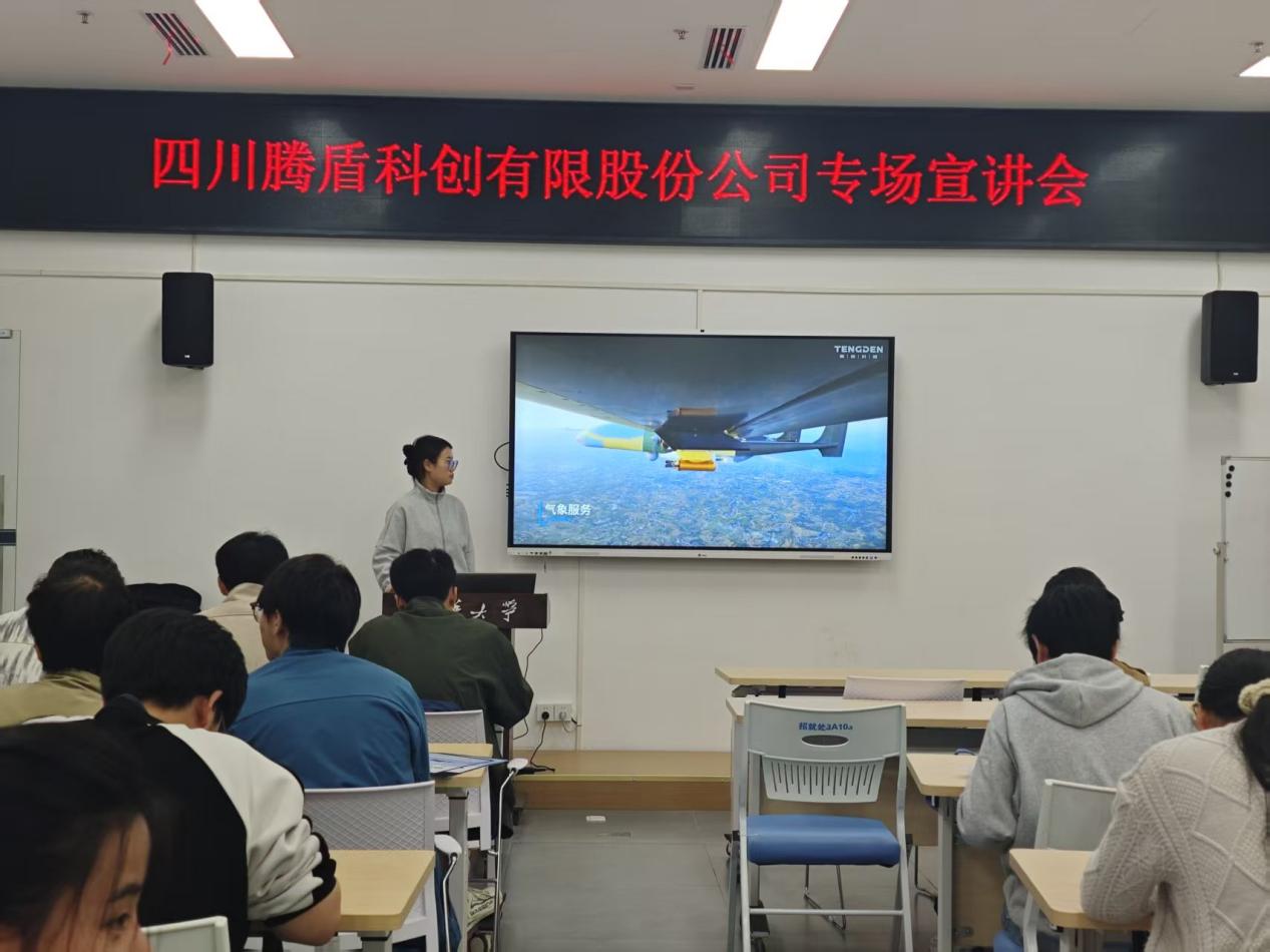 助力学子职业启航,聚焦航空科技未来。2025年10月21日下午15:30,四川腾盾科创股份有限公司(以下简称“腾盾科创”)专场招聘宣讲会于我校五食堂招就处5st-426教室顺利举行。本次活动旨在向我校航空航天学院等多个学院学子深入介绍公司发展概况、业务领域及招聘需求,并为有意向的毕业生提供现场简历投递与交流机会。