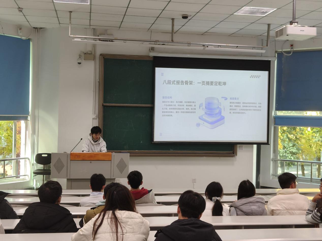 首先,2023级飞行器动力工程专业的刘满旭学姐率先带来“挑战杯”之旅分享,结合自己参赛的经历,从四个方面向同学们分享经验,讲述了从“零基础组队”到斩获省三等奖的成长过程,最后用一句话“行者常至,为者常成”,鼓励低年级同学们大胆尝试,在实践中积累经验。在答疑解惑环节,同学询问如何将项目由一个想法到落实环节,学姐结合自身经历告诉同学要由一个主题切入,分析其在现实的可行性。