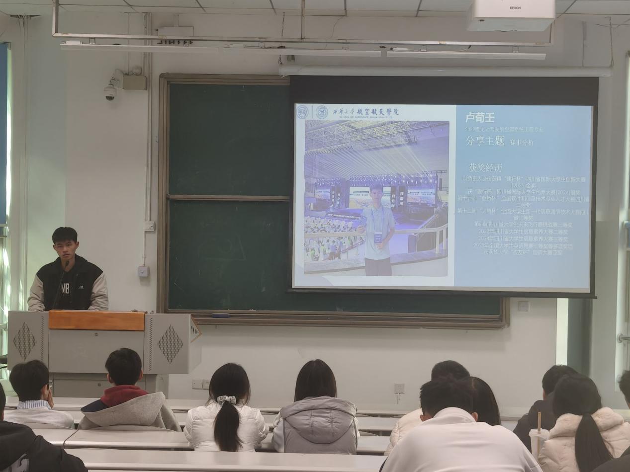 为了帮助学子积累竞赛经验、提升科创能力,11月27日下午14:00,西华大学航空航天与智能装备学院“挑战杯”竞赛经验分享会在4A201教室成功开展。本次分享会由西华大学航空航天与智能装备学院与“空天之光,铸魂育人”辅导员工作室主办、团委学生会承办,并邀请三位优秀的学长,学姐担任主讲人,为在场同学带来干货满满的竞赛指导。活动伊始,主持人周兴铭同学介绍了本次分享会的初衷——打破竞赛“信息差”,让更多航院学子在科创赛道上找准方向,同时介绍分享会环节:每位主讲人分享完后将会留给同学10分钟的提问时间。