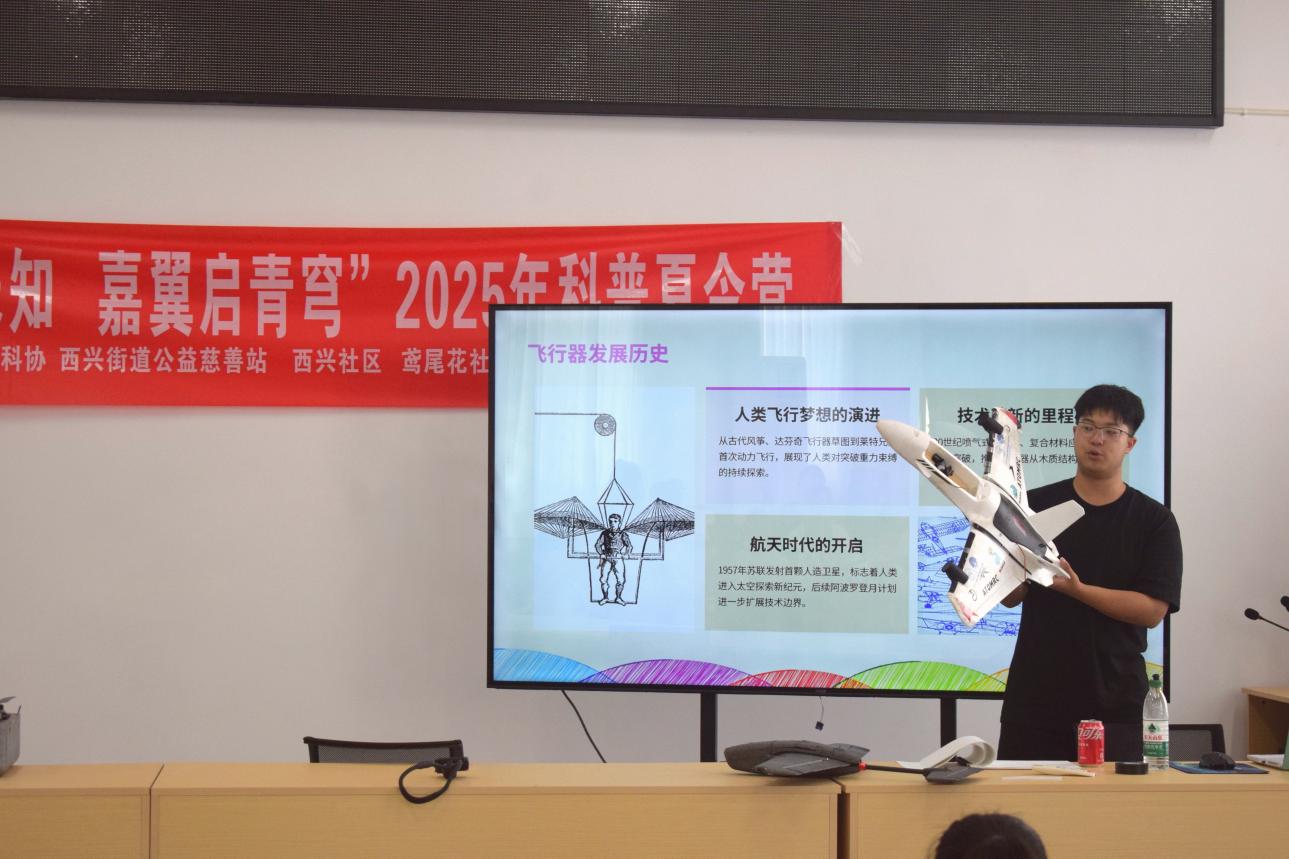 2025年7月13日至19日,由西华大学2023级航空航天类3班和4班团支部以及部分外校同学组建的“嘉翼启青穹”志愿服务队,携手西兴街道公益慈善站、鸢尾花社工中心,成功举办为期一周的科普夏令营。活动以“童心探未知 嘉翼启青穹”为主题,遵循“STEAM”教育理念,为20余名乡村儿童打造了一场融合科技探索、传统文化与心理健康教育的成长盛宴。 科技课程是本次夏令营的核心亮点。无人机探秘环节中,孩子们发挥奇思妙想设计彩虹翅膀、播种飞机等创意作品,在志愿者的生动讲解下,了解到无人机在农业植保、影视航拍、应急救援等领域的广泛应用,直观感受科技赋能生活的魅力。航天知识课堂上,志愿者以加加林、杨利伟的航天故事为引,用气球放气类比火箭推进原理,将抽象的科学知识具象化,点燃孩子们对太空的好奇与向往。 最受期待的水火箭发射实践环节,孩子们分组协作,从剪瓶身、粘尾翼到调试气压,全程亲自动手参与。当亲手制作的水火箭呼啸着冲向蓝天,现场欢呼声此起彼伏,孩子们在实践中深化了对科学原理的理解,成就感与探索热情被充分激发。 除科技探索外,夏令营还设置了多元成长课程。DIY皮影角色活动让孩子们感受传统文化魅力,“蝴蝶拍”情绪管理练习助力心理健康成长,身体健康知识讲解则为孩子们的成长保驾护航,全方位促进“德智体美劳”全面发展。 闭营仪式上,孩子们纷纷写下心中憧憬,“我要当航天工程师”“我想做无人机设计师”的字句,承载着对未来的无限向往。孩子们抛出的航模飞机,既是对本次夏令营的告别,更是探索航空航天科技梦想的启航。 此次科普夏令营不仅让乡村儿童近距离触摸科技前沿,更在他们心中播下了梦想的种子。志愿者们以专业与热情践行社会责任,展现了新时代青年反哺社会的担当,为乡村儿童的成长插上了逐梦的翅膀。