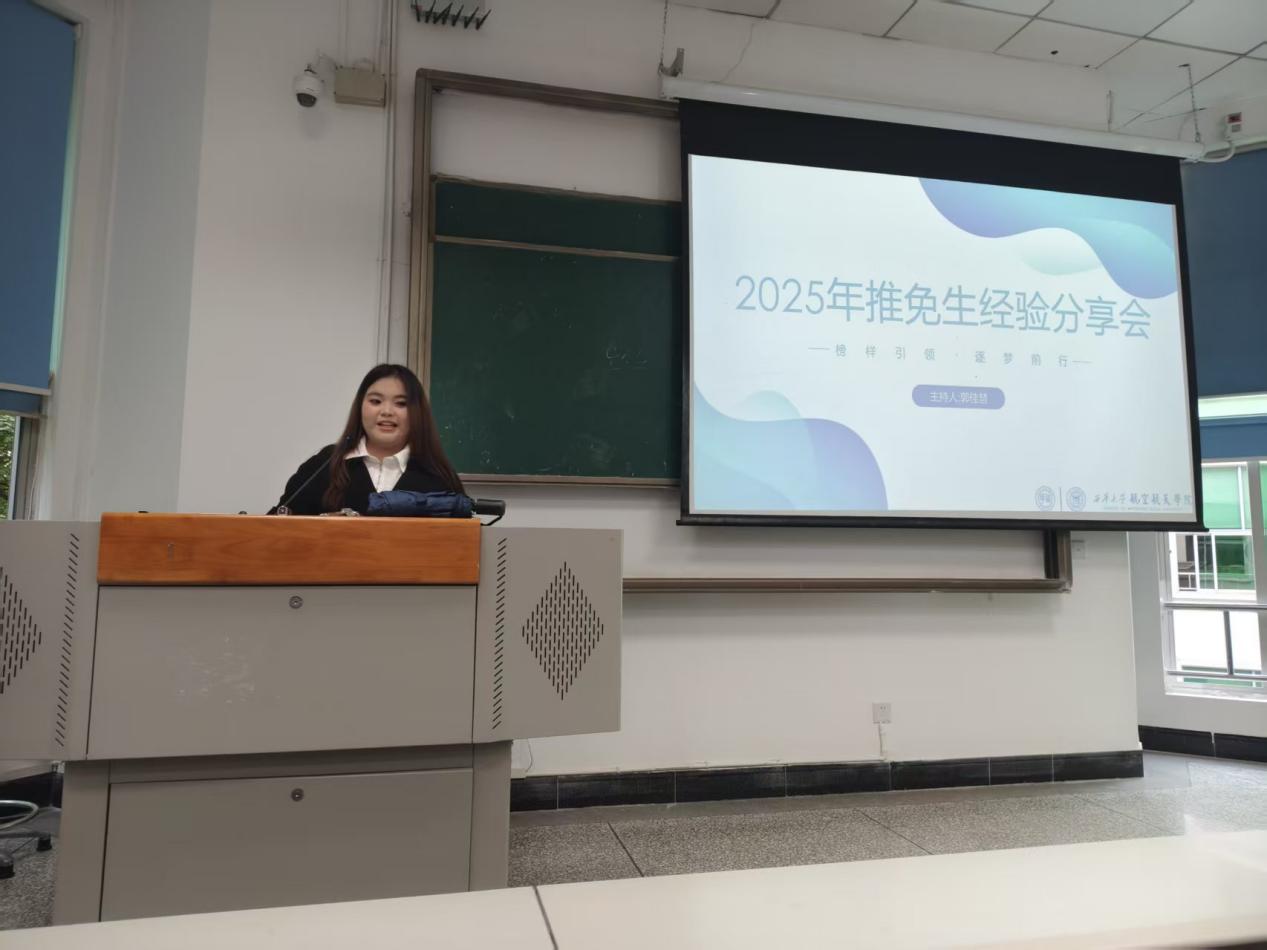 为帮助学子明确推免方向、掌握备考技巧,西华大学航空航天学院于2025年10月21日举办推免生经验分享会。本次分享会邀请多名成功推免的学长学姐担任主讲嘉宾,学院各年级学生积极参与,大家共同从中学习学长学姐的生活和学习生活经验。分享会中,张楷东学长从自身学习和科研经历告诉大家自己学习和科研的经历以及能用的到软件;郭士荣学长从人生经验的重要性入题,分享了自己最终成为光的故事;雷涵喆学姐则告诉了大家一些自己在学习中应对焦虑情绪的方法;刘瑶学姐则从自己从只有游戏战绩到保研一路上的学习方法;卢荀壬学长则从自己硕果累累竞赛科研的经历来告诉了大家三年中学习的建议,去做一些适应当下价值的事;潘兴行学长从最适用的一些对保研有利的竞赛出发,向同学们提供了一些性价比较高的竞赛;最后肖裕坤学长简短的告诫了大家学习在大学生活的重要性同学们对于在学术学业上该如何规划向学长们提出了疑问,学长学姐都耐心地做出了解答。最后,参会的同学与各位保研的学长学姐进行了合影留念。此次分享会为学院学子搭建了高效的交流平台,不仅清晰梳理了推免流程与关键节点,更传递了积极向上的升学态度。同学们纷纷表示,通过分享会收获颇丰,对推免之路有了更清晰的规划,未来将以优秀学长学姐为榜样,扎实学好专业知识,积极参与科研实践,为投身航空航天事业、实现升学目标而努力拼搏。